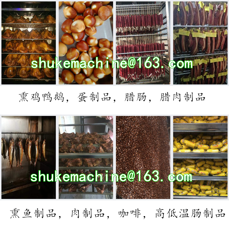 本機用于煙熏肉制品熟食,熏雞,熏鴨、熏鴿、烤腸,烤雞,熏魚,烤鴨,煙熏豆腐干臘肉以及家禽,水產(chǎn)品等等熏制產(chǎn)品,烘干,上色一次成型.煙熏色澤好,口感更佳.質(zhì)量保證,技術(shù)優(yōu)良,操作方便.經(jīng)過煙熏后食品的顏色好看,還有一種煙熏后的香味,讓人感覺香而不膩,也能達到環(huán)保效果,徹底代替了傳統(tǒng)的煙熏爐方法,節(jié)省了工人的勞動了,提高工作效率,更增強了食品的口感及彈性。主循環(huán)風(fēng)扇送風(fēng)均勻,使?fàn)t體內(nèi)溫度均勻,采用設(shè)定參數(shù)方式,通用性廣,自動運行中的參數(shù)可修正。