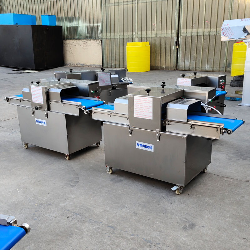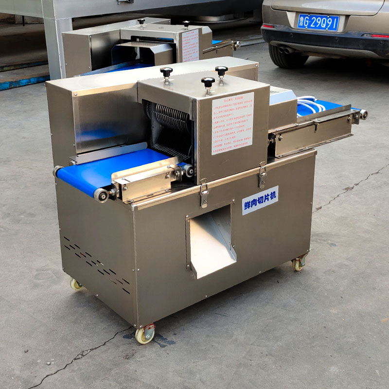 本機可以將鮮肉或者冰鮮肉原料切成大小均勻的條狀,切割尺寸均勻,輸送帶式連續作業,可以單機工作,也可以配套流水線使用。切割規格可定制,可以通過更換快拆刀組實現不同規格肉條切割??捎糜跓o骨雞柳,風干牛肉條等產品的加工。
